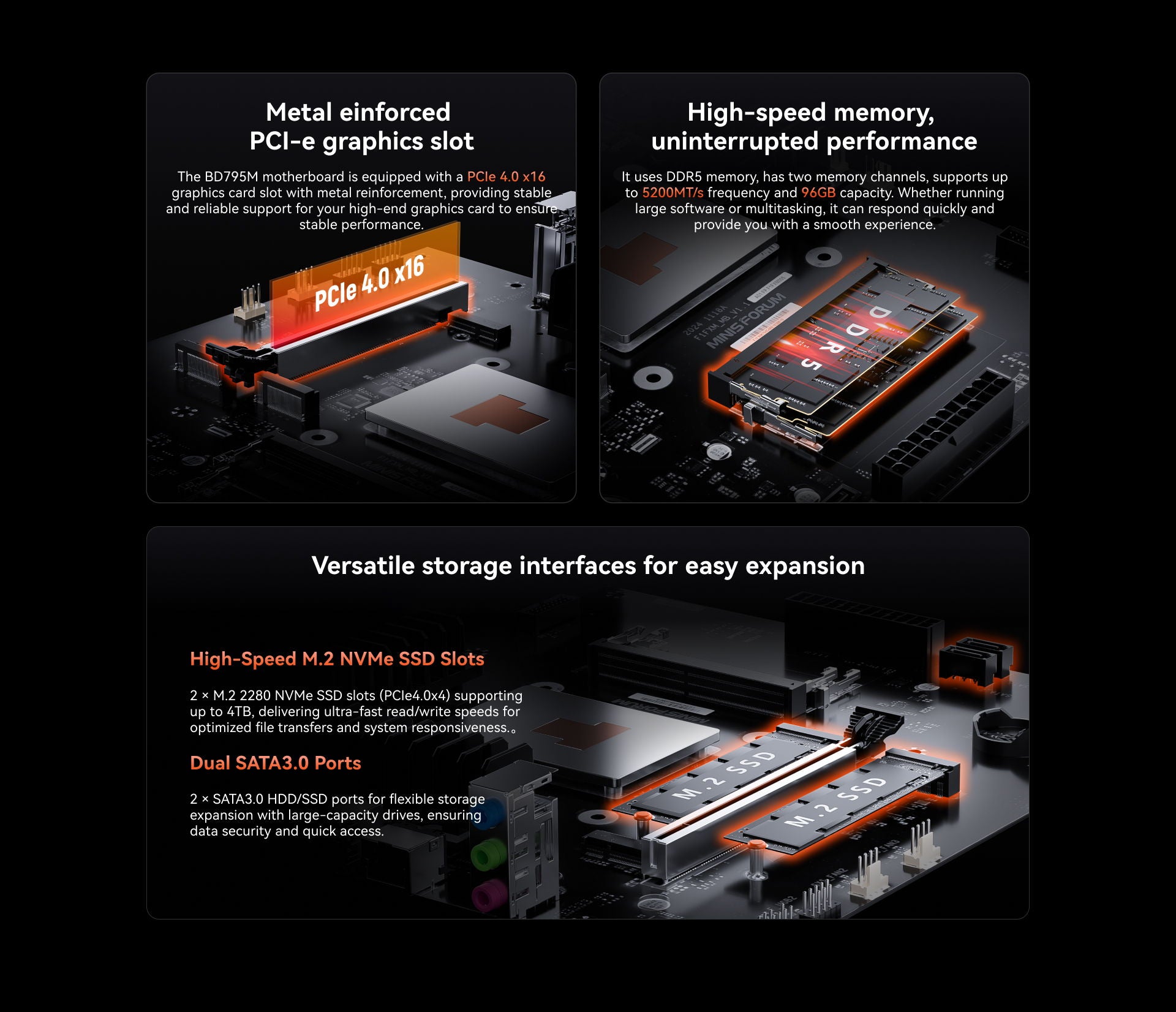 The BD795M motherboard is equipped with the AMD Ryzen™ 9 7945HX processor,with 16 cores and 32 threads, up to 5.4 GHz, bringing you unprecedented powerful computing power.