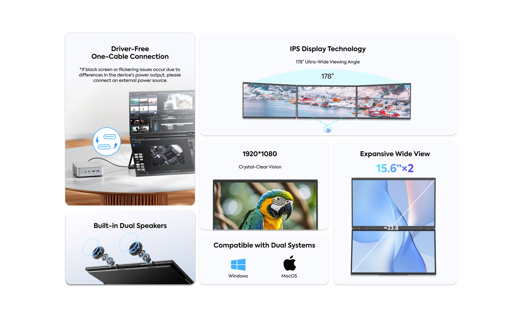 Featuring dual 15.6-inch large displays (equivalent to 23.8 inches) with IPS 178° wide viewing technology and ultra-slim bezels, delivering a revolutionary immersive visual experience.