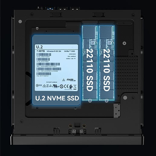 It also supports enterprise-class storage, allowing for expansion up to a total maximum of 24TB with a configuration of one U.2 NVMe SSD and two 22110 M.2 NVMe SSDs. This meets the demands of professionals who require high-capacity storage.
