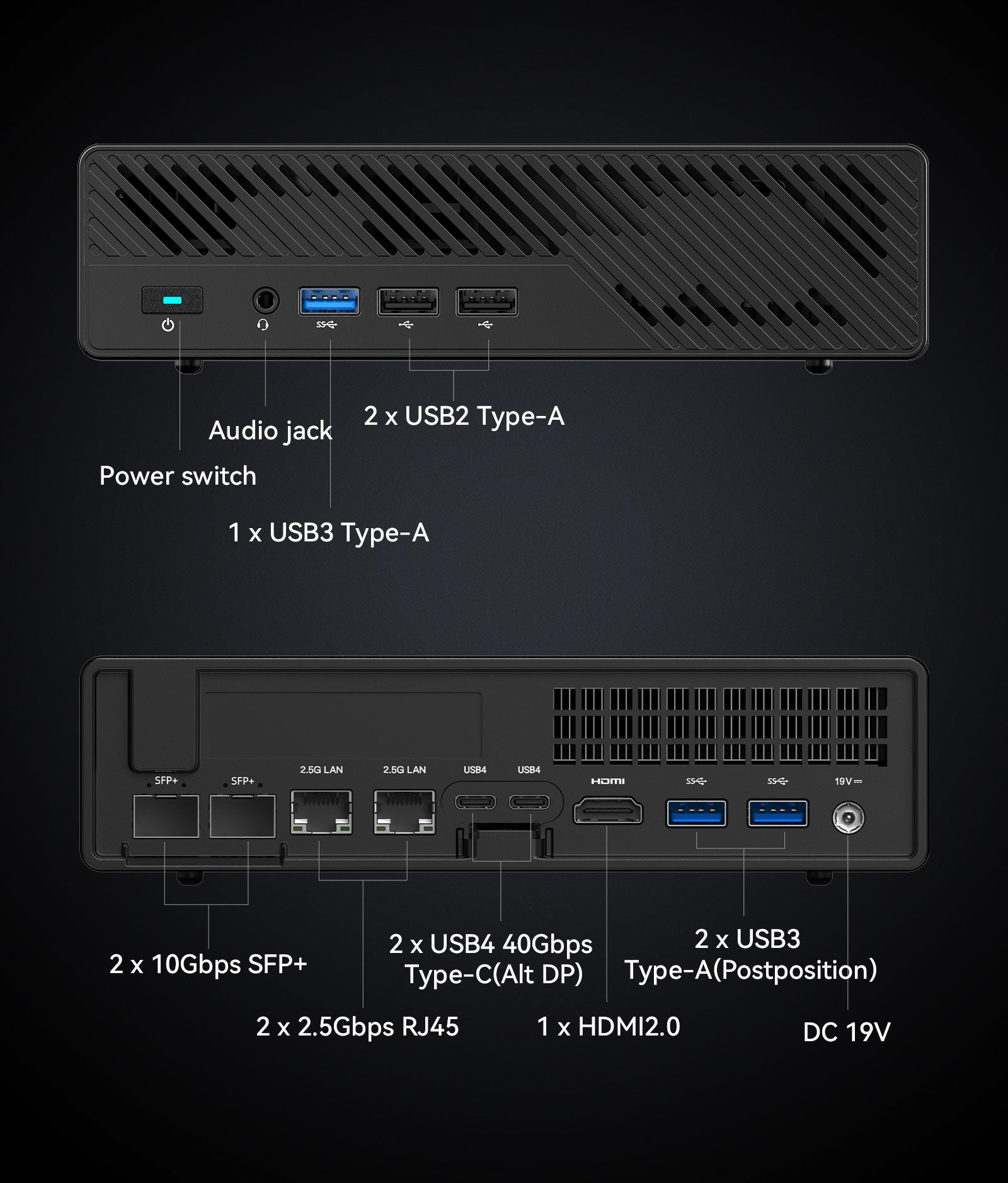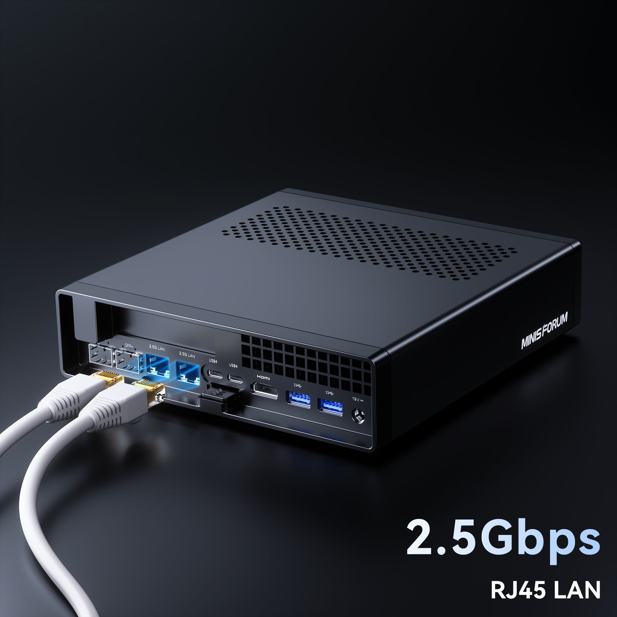 The MS-01 is equipped with two 10Gbps SFP+ Ethernet ports. The SFP+ modules offer high stability, and the optical fiber transmission ensures network security by preventing eavesdropping and interception.