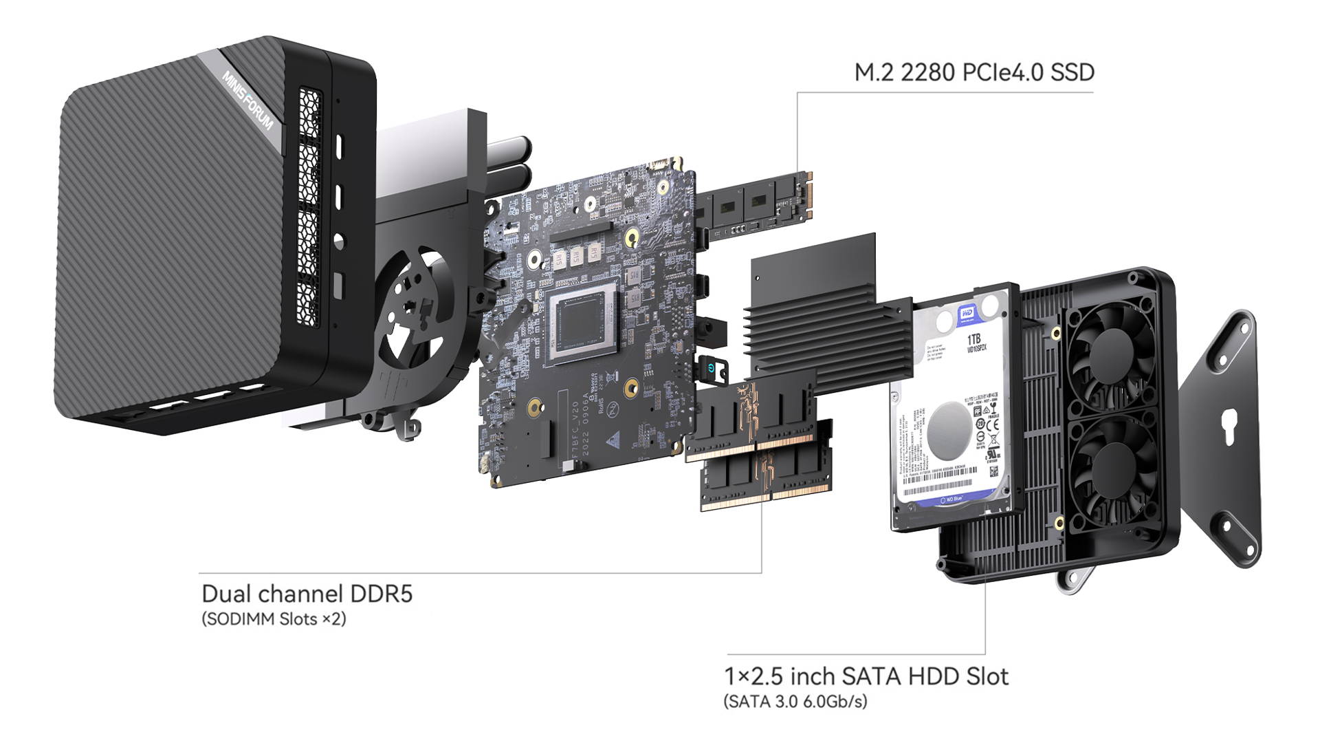 The DDR5 dual-channel memory, M.2 2280 PCIe SSD, and 2.5-inch SATA 3.0 HDD are all available for further upgrade and expansion. You can upgrade the memory and storage capacity for better data reading/writing, higher data transfer speed, and more storage space.