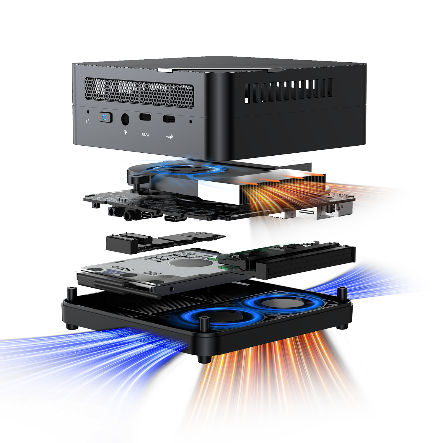 UM690s adopts 4 air vents on the case for fluent airflow. The smart fan inhales cooler air through 2 air vents into the case and blows out hotter air through the other 2 air vents to lower the ambient temperature.