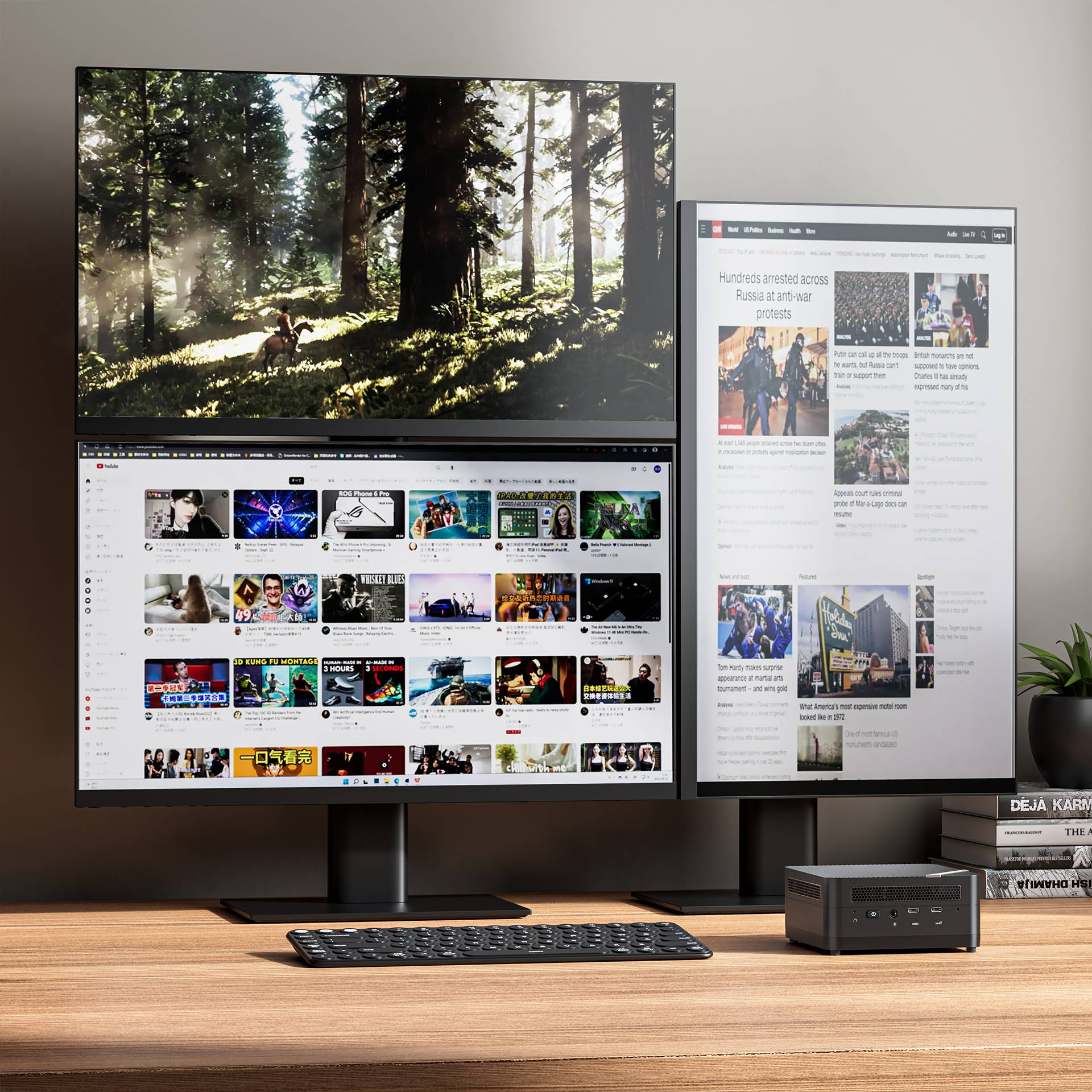 UM690s is equipped with one USB4 port for the best-in-class 8K@60Hz display experience. You can connect UM690s to three monitors at the same time via the USB4 port and two HDMI ports. This setup supports a staggering resolution of two 4K@60Hz plus one 8K@60Hz, and pushes multitasking and visual experience to the next level.