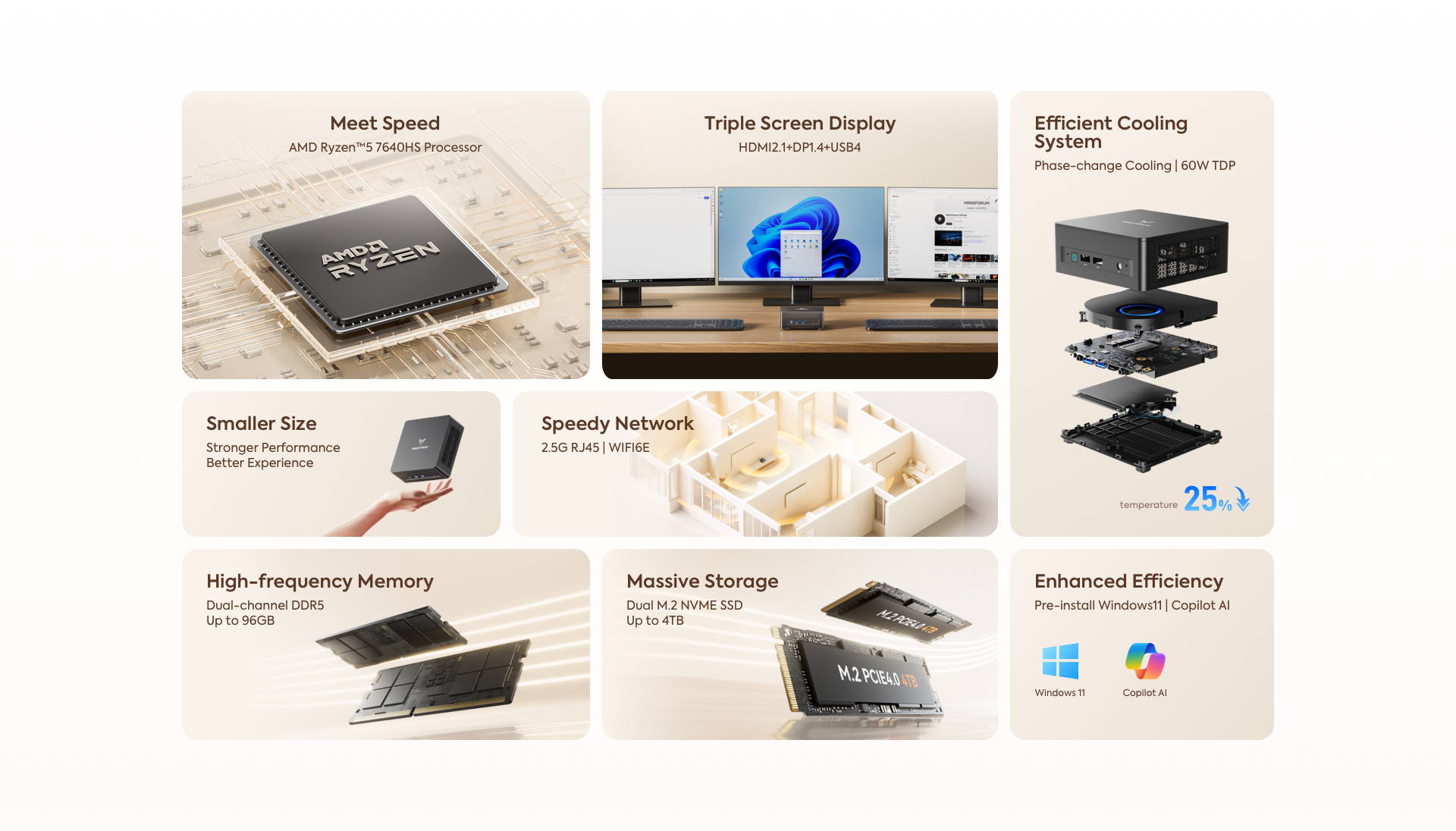 - Expandable Storage: 2x DDR5 SODIMM slot, 2x PCIe4.0 SSD Slot
